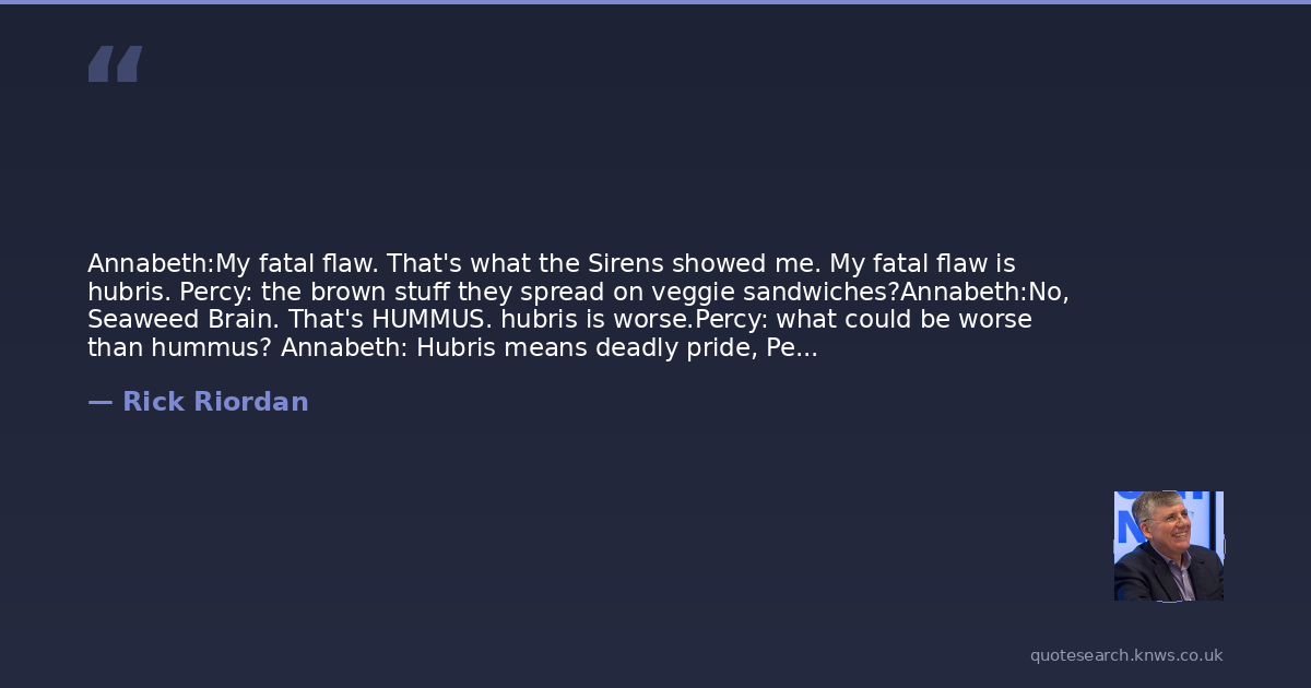 Annabeth:My fatal flaw. That's what the Sirens showed me. My fatal flaw is hubris. Percy: the brown stuff they spread on veggie sandwiches?Annabeth:No, Seaweed Brain. That's HUMMUS. hubris is worse.Percy: what could be worse than hummus? Annabeth: Hubris means deadly pride, Percy. Thinking you can do things better than anyone else... Even the gods.