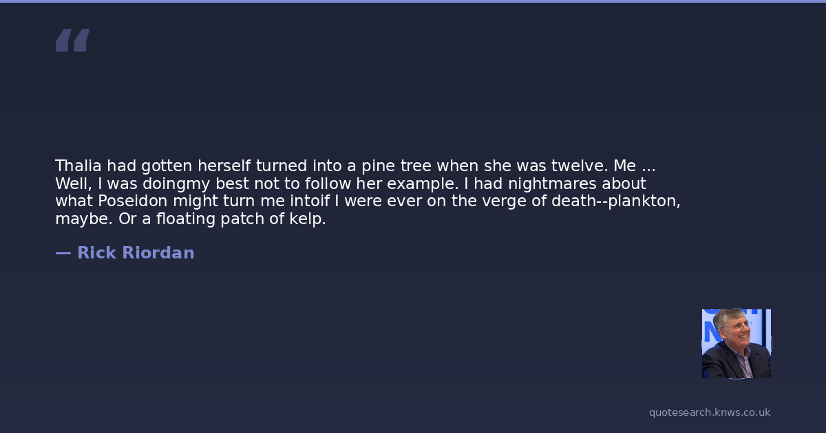 Thalia had gotten herself turned into a pine tree when she was twelve. Me ... Well, I was doingmy best not to follow her example. I had nightmares about what Poseidon might turn me intoif I were ever on the verge of death--plankton, maybe. Or a floating patch of kelp.