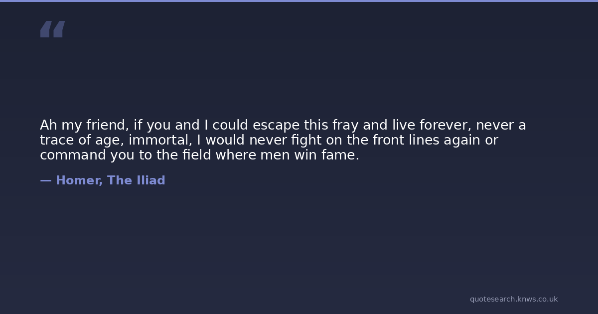 Ah my friend, if you and I could escape this fray and live forever, never a trace of age, immortal, I would never fight on the front lines again or command you to the field where men win fame.