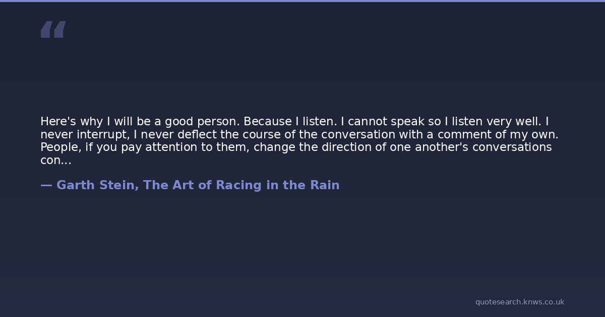 Here's why I will be a good person. Because I listen. I cannot speak so I listen very well. I never interrupt, I never deflect the course of the conversation with a comment of my own. People, if you pay attention to them, change the direction of one another's conversations constantly. it's like having a passenger in your car who suddenly grabs the steering wheel and turns you down a side street.