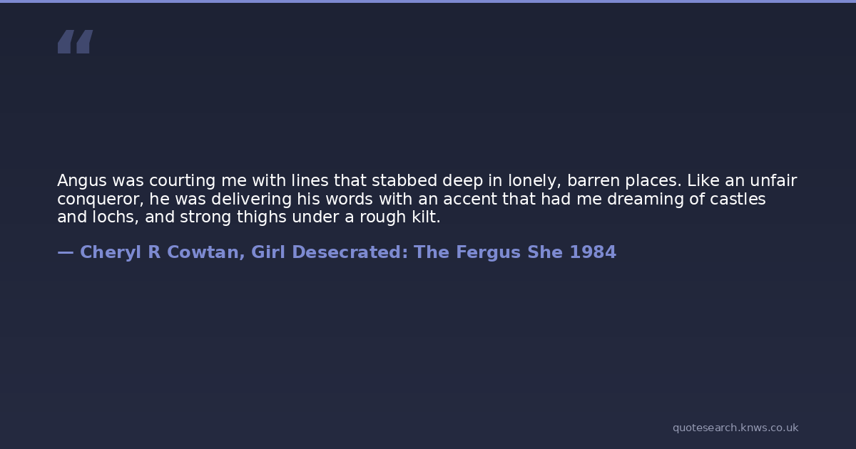 Angus was courting me with lines that stabbed deep in lonely, barren places. Like an unfair conqueror, he was delivering his words with an accent that had me dreaming of castles and lochs, and strong thighs under a rough kilt.