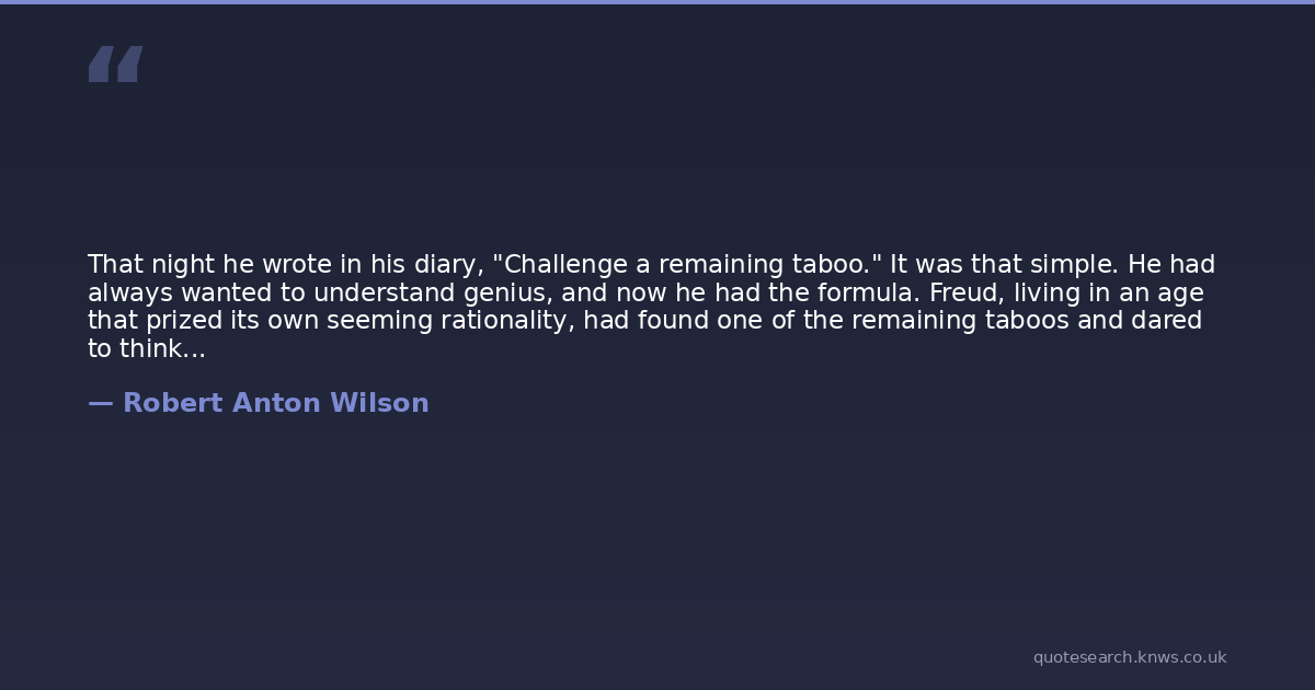 That night he wrote in his diary, "Challenge a remaining taboo." It was that simple. He had always wanted to understand genius, and now he had the formula. Freud, living in an age that prized its own seeming rationality, had found one of the remaining taboos and dared to think beyond it: he discovered infant sexuality and the unconscious, among other things. Galileo had gone beyond the taboo "Thou shalt not question Aristotle." Every great discovery had been the breaking of a taboo.