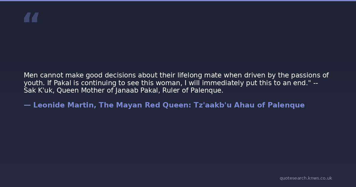 Men cannot make good decisions about their lifelong mate when driven by the passions of youth. If Pakal is continuing to see this woman, I will immediately put this to an end." -- Sak K'uk, Queen Mother of Janaab Pakal, Ruler of Palenque.