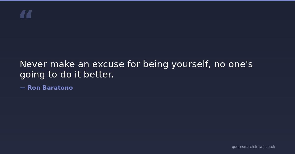 Never make an excuse for being yourself, no one's going to do it better. excuses person yourself Download Image Share on X Share on Facebook Copy Link