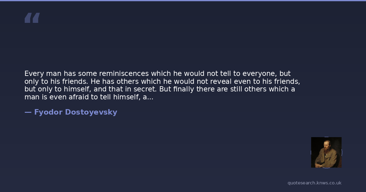Every man has some reminiscences which he would not tell to everyone, but only to his friends. He has others which he would not reveal even to his friends, but only to himself, and that in secret. But finally there are still others which a man is even afraid to tell himself, and every decent man has a considerable number of such things stored away. That is, one can even say that the more decent he is, the greater the number of such things in his mind.
