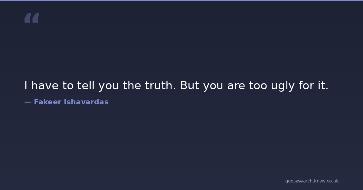 I have to tell you the truth. But you are too ugly for it. funny-humor funny-insults funny-life-quotes funny-quotes good-and-evil humorous-quotations humour-quote laughter-is-the-best-medicine laughter-quotes philosophical-musings sarcasm-humor truth-telling ugly-truths wellness-guru Download Image Share on X Share on Facebook Copy Link