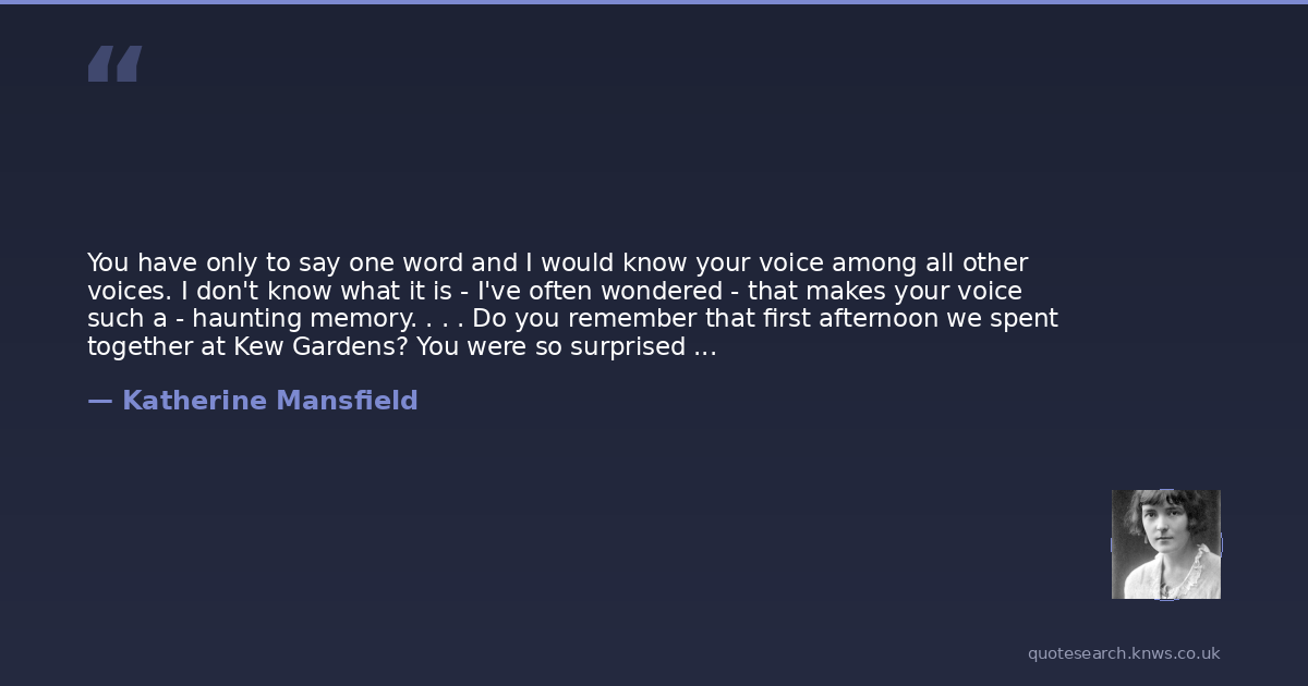 You have only to say one word and I would know your voice among all other voices. I don't know what it is - I've often wondered - that makes your voice such a - haunting memory. . . . Do you remember that first afternoon we spent together at Kew Gardens? You were so surprised because I did not know the names of any flowers. I am still just as ignorant for all your telling me. But whenever it is very fine and warm, and I see some bright colours - it's awfully strange - I hear your voice saying : "Geranium, marigold and verbena." And I feel those three words are all I recall of some forgotten, heavenly language. . . .