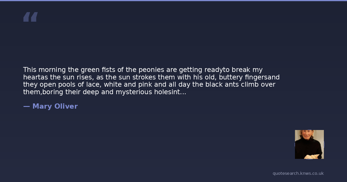This morning the green fists of the peonies are getting readyto break my heartas the sun rises, as the sun strokes them with his old, buttery fingersand they open pools of lace, white and pink and all day the black ants climb over them,boring their deep and mysterious holesinto the curls, craving the sweet sap, taking it awayto their dark, underground cities and all dayunder the shifty wind, as in a dance to the great wedding,the flowers bend their bright bodies, and tip their fragrance to the air, and rise, their red stems holdingall that dampness and recklessness gladly and lightly, and there it is again beauty the brave, the exemplary,blazing open. Do you love this world? Do you cherish your humble and silky life? Do you adore the green grass, with its terror beneath?Do you also hurry, half-dressed and barefoot, into the garden, and softly, and exclaiming of their dearness, fill your arms with the white and pink flowers,with their honeyed heaviness, their lush trembling, their eagernessto be wild and perfect for a moment, before they arenothing, forever?