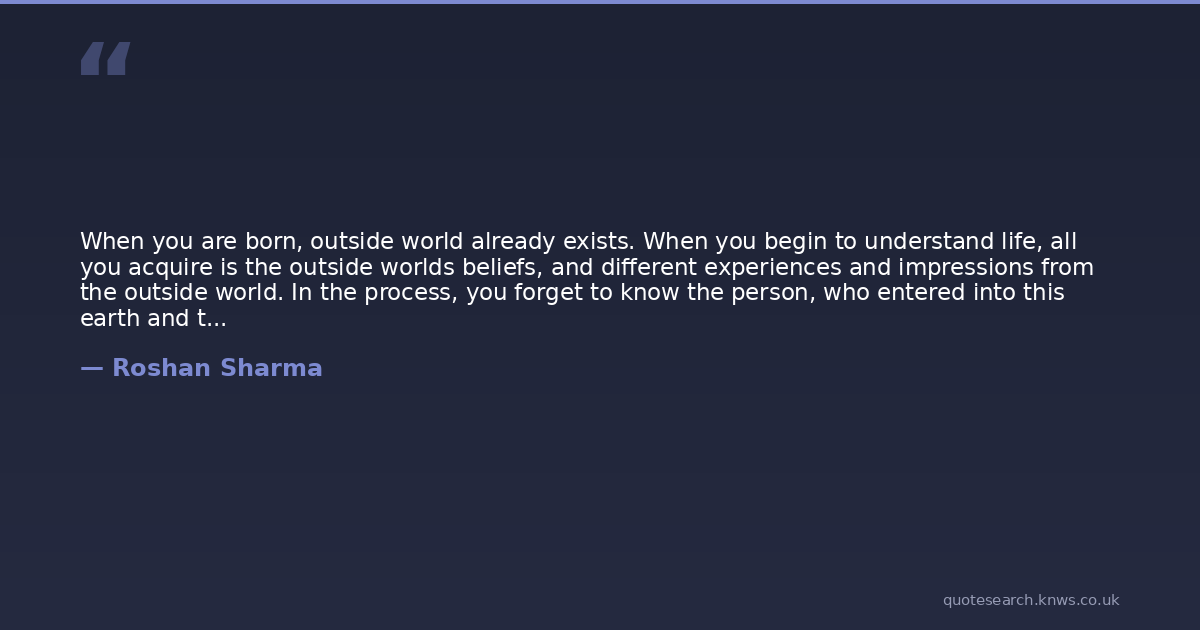 When you are born, outside world already exists. When you begin to understand life, all you acquire is the outside worlds beliefs, and different experiences and impressions from the outside world. In the process, you forget to know the person, who entered into this earth and the purpose of his birth.