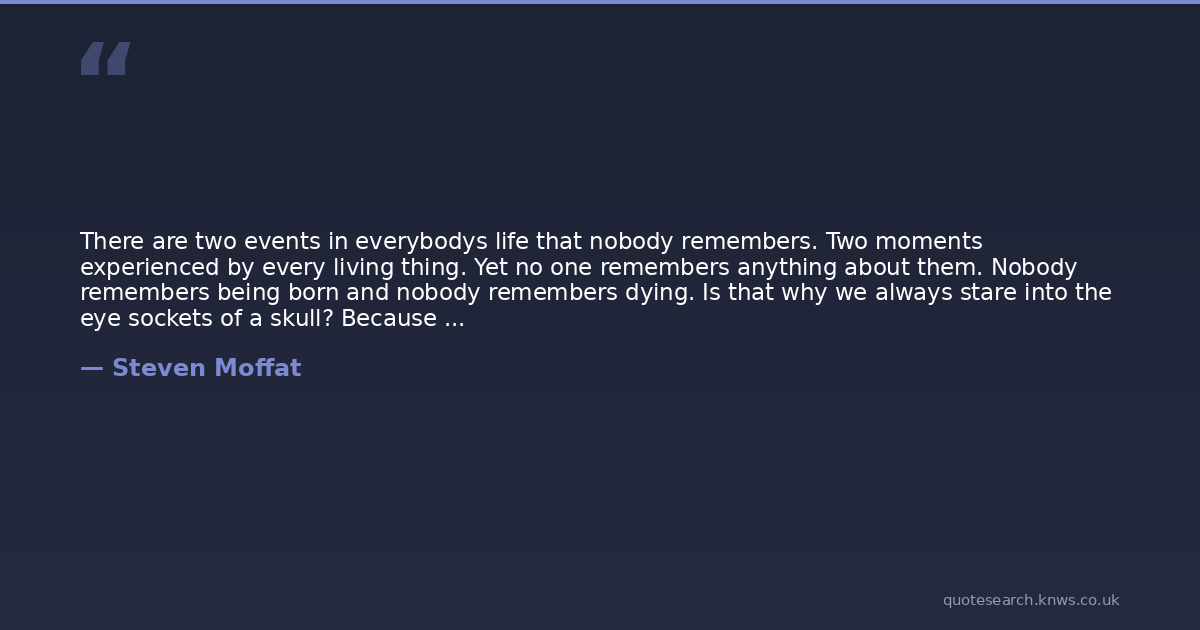 There are two events in everybodys life that nobody remembers. Two moments experienced by every living thing. Yet no one remembers anything about them. Nobody remembers being born and nobody remembers dying. Is that why we always stare into the eye sockets of a skull? Because were asking, What was it like? Does it hurt? Are you still scared?.