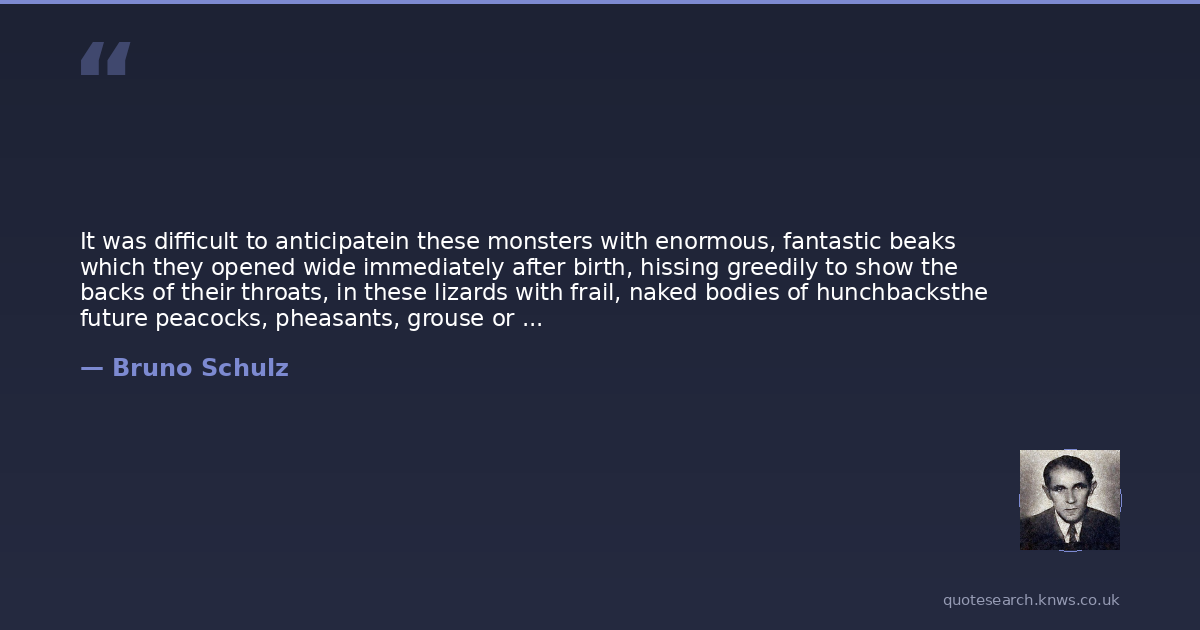 It was difficult to anticipatein these monsters with enormous, fantastic beaks which they opened wide immediately after birth, hissing greedily to show the backs of their throats, in these lizards with frail, naked bodies of hunchbacksthe future peacocks, pheasants, grouse or condors. Placed in cotton wool, in baskets, this dragon brood lifted blind, walleyed heads on thin necks, croaking voicelessly from their dumb throats.