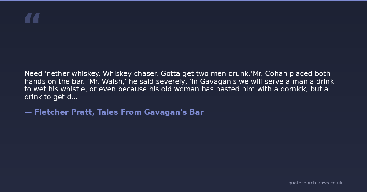 Need 'nether whiskey. Whiskey chaser. Gotta get two men drunk.'Mr. Cohan placed both hands on the bar. 'Mr. Walsh,' he said severely, 'in Gavagan's we will serve a man a drink to wet his whistle, or even because his old woman has pasted him with a dornick, but a drink to get drunk with I do not sell. Now I'm telling you you've had enough for tonight, and in the morning you'll be thanking me...' ("My Brother's Keeper")