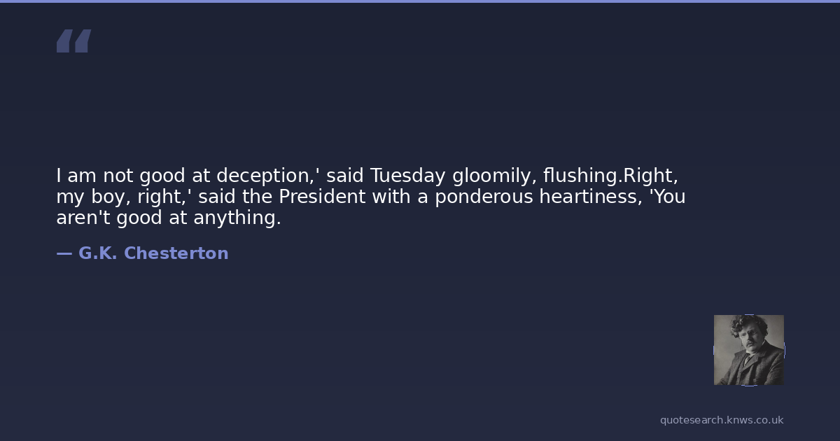 I am not good at deception,' said Tuesday gloomily, flushing.Right, my boy, right,' said the President with a ponderous heartiness, 'You aren't good at anything.
