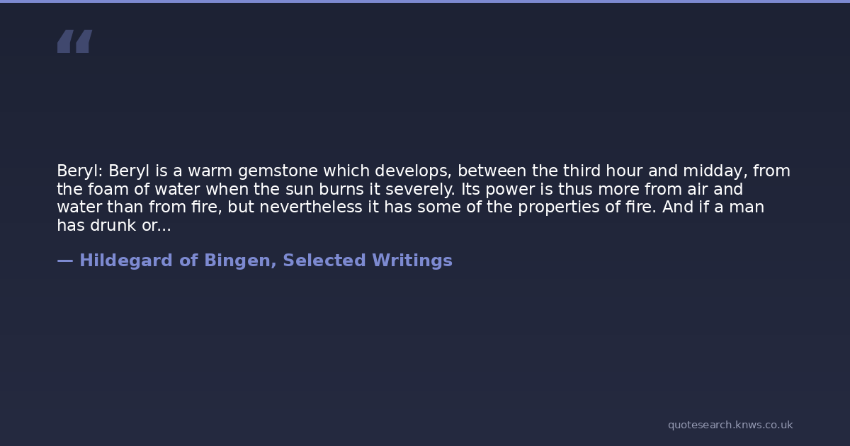 Beryl: Beryl is a warm gemstone which develops, between the third hour and midday, from the foam of water when the sun burns it severely. Its power is thus more from air and water than from fire, but nevertheless it has some of the properties of fire. And if a man has drunk or eaten poison, then he should place a little beryl in spring water and drink it at once. Continue for five days drinking it once a day while fasting, and the poison will foam up through vomiting, or it will pass out of him through the rear.