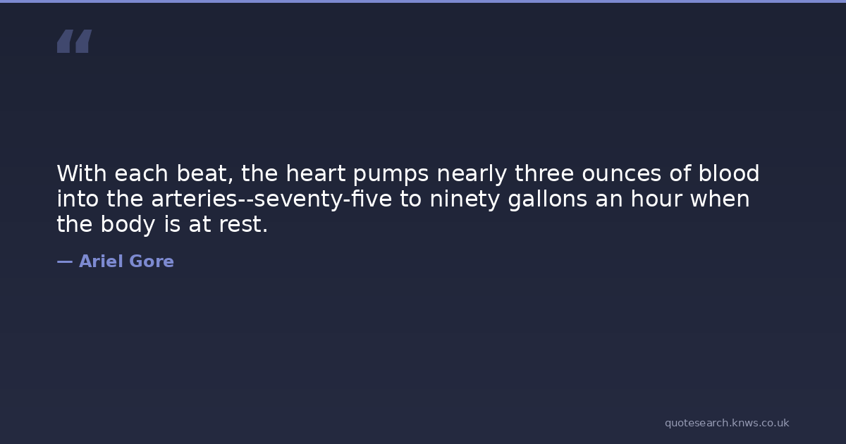 With each beat, the heart pumps nearly three ounces of blood into the arteries--seventy-five to ninety gallons an hour when the body is at rest.