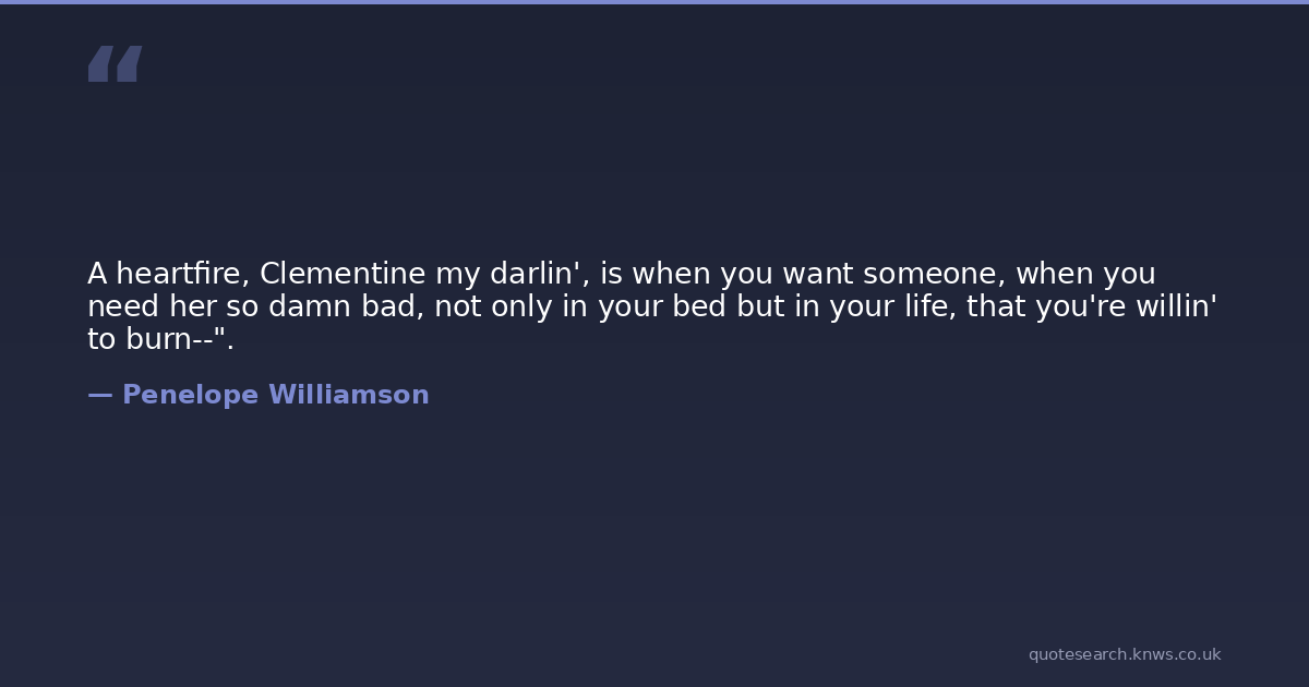 A heartfire, Clementine my darlin', is when you want someone, when you need her so damn bad, not only in your bed but in your life, that you're willin' to burn--".
