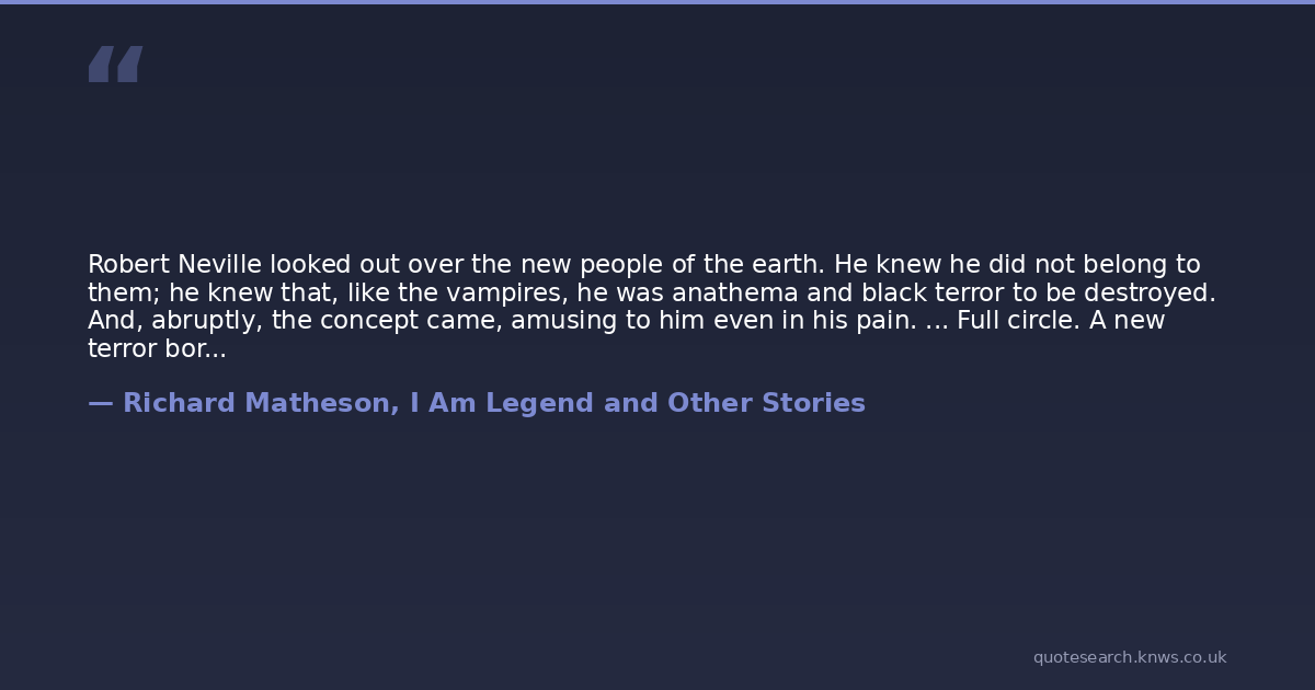 Robert Neville looked out over the new people of the earth. He knew he did not belong to them; he knew that, like the vampires, he was anathema and black terror to be destroyed. And, abruptly, the concept came, amusing to him even in his pain. ... Full circle. A new terror born in death, a new superstition entering the unassailable fortress of forever. I am legend.