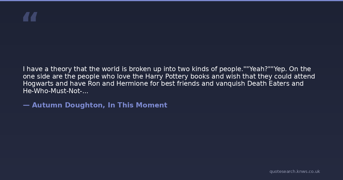 I have a theory that the world is broken up into two kinds of people.""Yeah?""Yep. On the one side are the people who love the Harry Pottery books and wish that they could attend Hogwarts and have Ron and Hermione for best friends and vanquish Death Eaters and He-Who-Must-Not-Be-Named."She's smiling at me, and she's just so fucking cute. I have to ask: "And the other side?"Aimee shrugs. "Douchebags.
