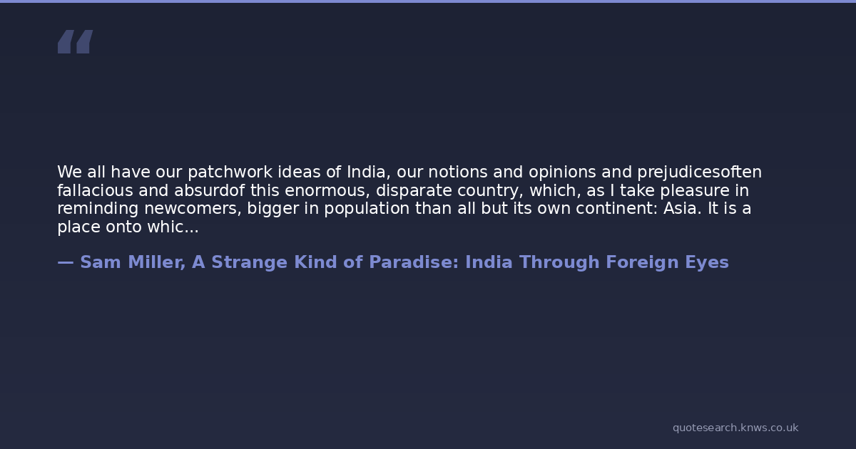We all have our patchwork ideas of India, our notions and opinions and prejudicesoften fallacious and absurdof this enormous, disparate country, which, as I take pleasure in reminding newcomers, bigger in population than all but its own continent: Asia. It is a place onto which foreigners have projected their own exotic fantasies and fears, their explanatory and simplifying schemata. And they never seem quite to make up their mindsas they swing from one extreme to the otherwhether this country is of great wealth or of appalling poverty, of spiritual renunciation or of unabashed materialism, of fasting or of gluttony, of erotic sophistication or of sexual puritanism, of corruption or of moral superiority. They probably fail to admit that it might be all these things, and even more so, everything in between.