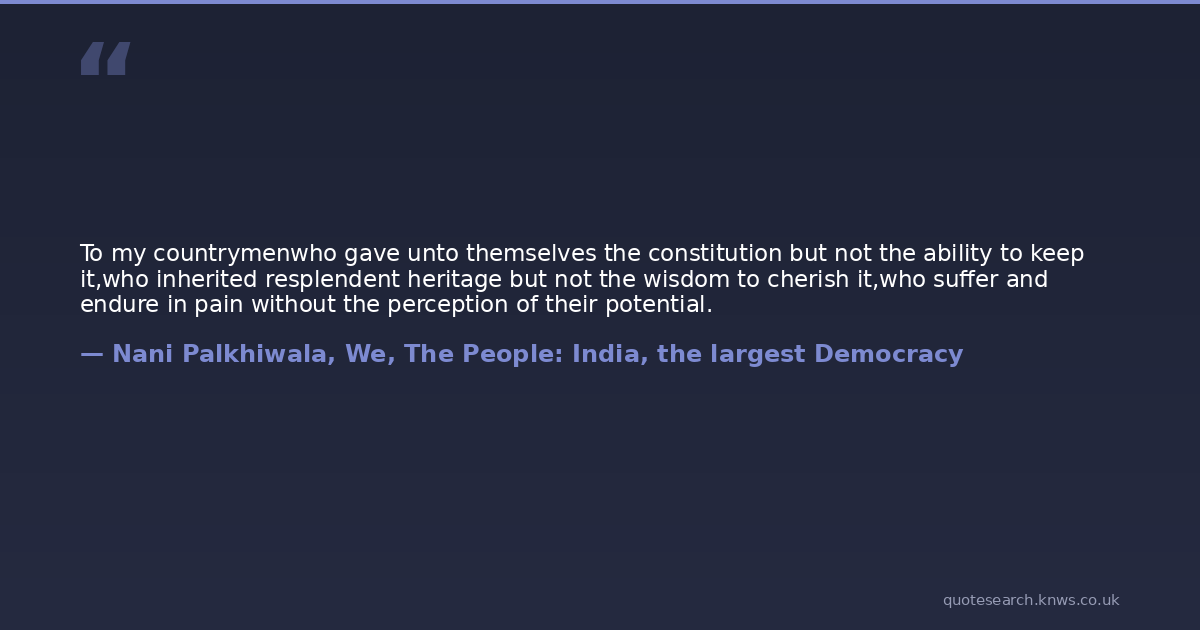 To my countrymenwho gave unto themselves the constitution but not the ability to keep it,who inherited resplendent heritage but not the wisdom to cherish it,who suffer and endure in pain without the perception of their potential.