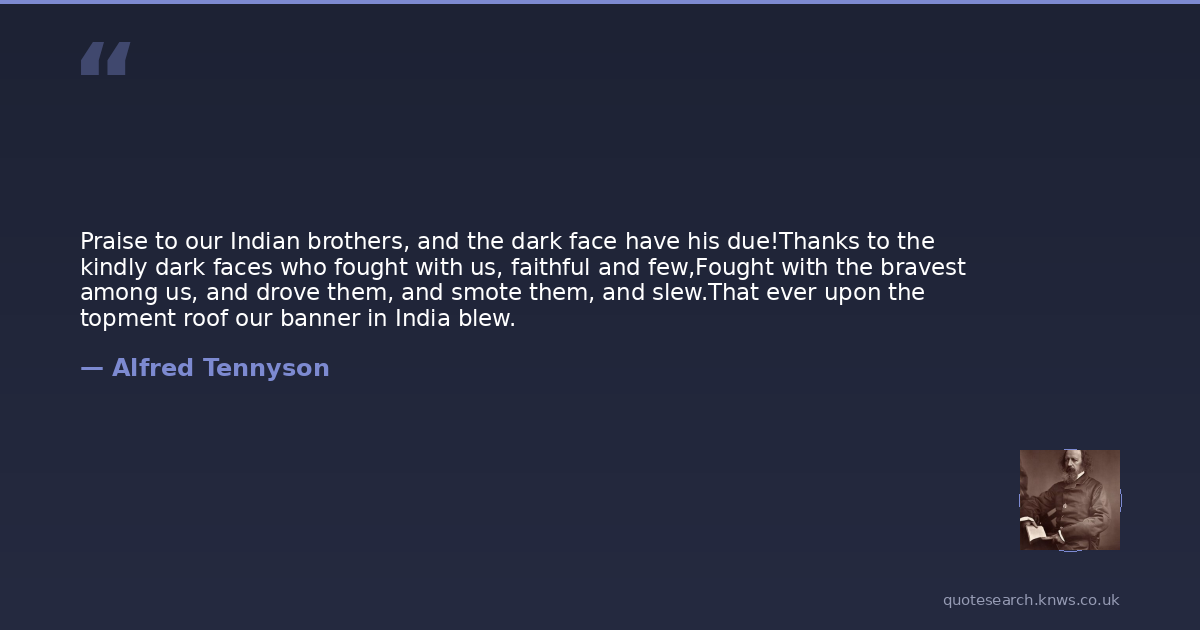 Praise to our Indian brothers, and the dark face have his due!Thanks to the kindly dark faces who fought with us, faithful and few,Fought with the bravest among us, and drove them, and smote them, and slew.That ever upon the topment roof our banner in India blew.
