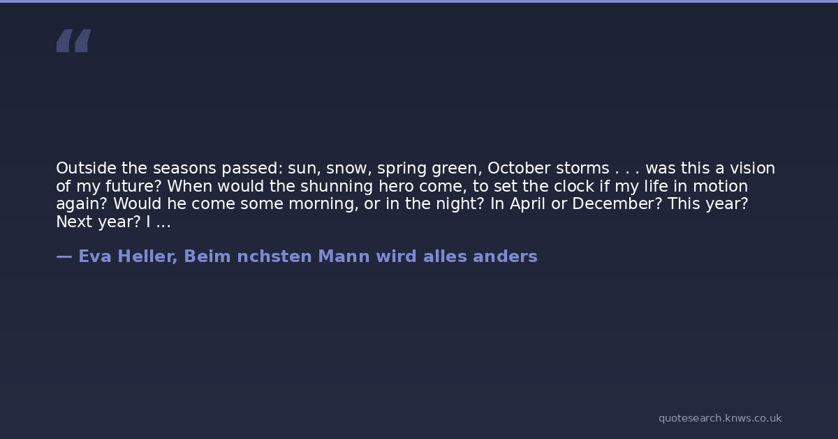 Outside the seasons passed: sun, snow, spring green, October storms . . . was this a vision of my future? When would the shunning hero come, to set the clock if my life in motion again? Would he come some morning, or in the night? In April or December? This year? Next year? I shuddered. No, I wouldn't just sit and wait. I wanted to go out.Maybe there were new men out there, better men, men who'd just been waiting for me. Somewhere someone is always waiting for someone.