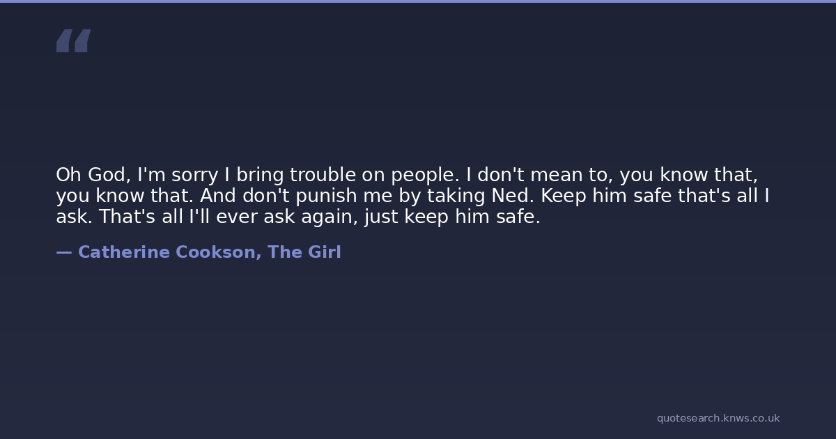 Oh God, I'm sorry I bring trouble on people. I don't mean to, you know that, you know that. And don't punish me by taking Ned. Keep him safe that's all I ask. That's all I'll ever ask again, just keep him safe.