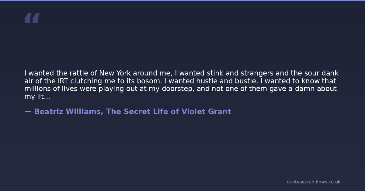 I wanted the rattle of New York around me, I wanted stink and strangers and the sour dank air of the IRT clutching me to its bosom. I wanted hustle and bustle. I wanted to know that millions of lives were playing out at my doorstep, and not one of them gave a damn about my little problems.