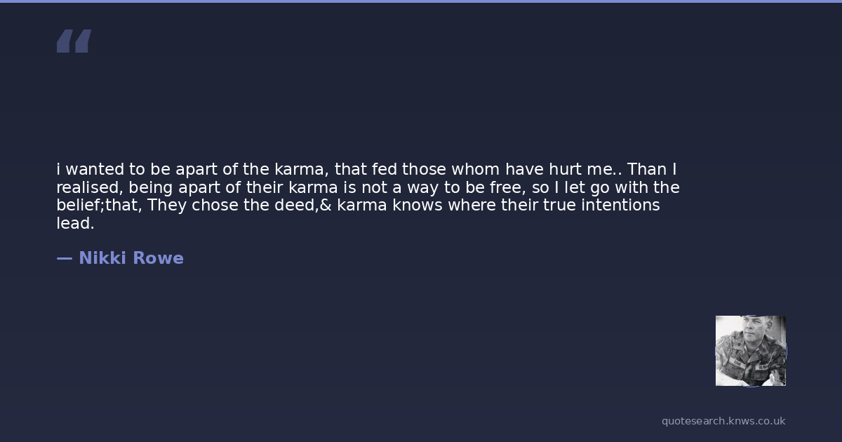 i wanted to be apart of the karma, that fed those whom have hurt me.. Than I realised, being apart of their karma is not a way to be free, so I let go with the belief;that, They chose the deed,& karma knows where their true intentions lead.