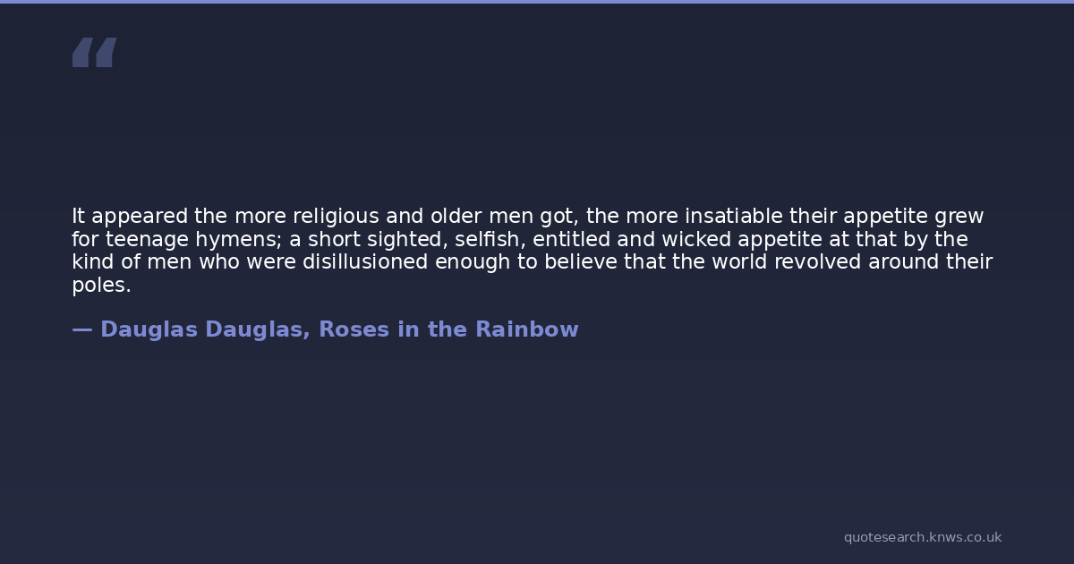It appeared the more religious and older men got, the more insatiable their appetite grew for teenage hymens; a short sighted, selfish, entitled and wicked appetite at that by the kind of men who were disillusioned enough to believe that the world revolved around their poles.