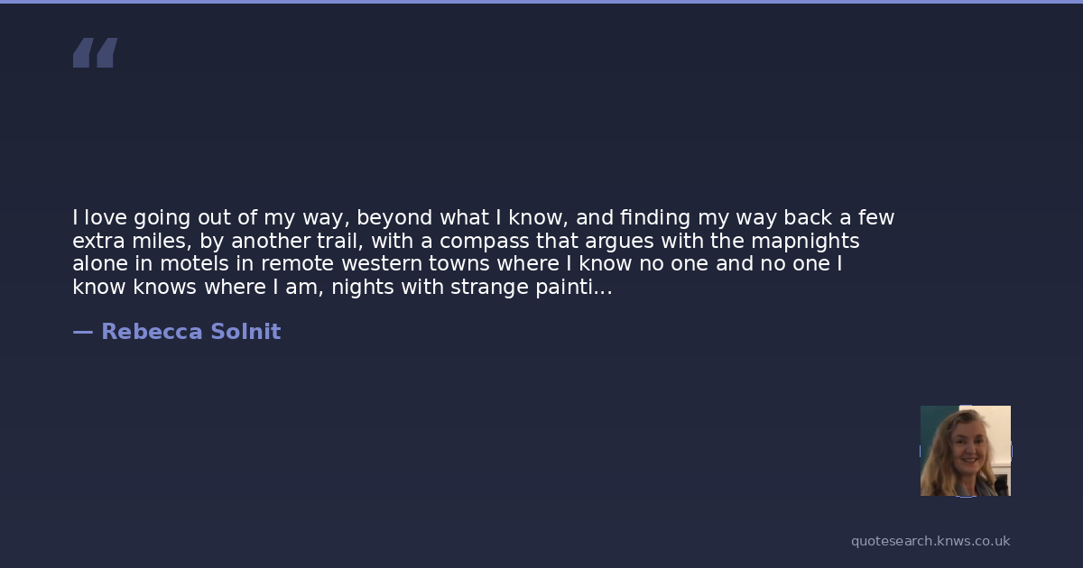 I love going out of my way, beyond what I know, and finding my way back a few extra miles, by another trail, with a compass that argues with the mapnights alone in motels in remote western towns where I know no one and no one I know knows where I am, nights with strange paintings and floral spreads and cable television that furnish a reprieve from my own biography, when in Benjamins terms, I have lost myself though I know where I am. Moments when I say to myself as feet or car clear a crest or round a bend, I have never seen this place before. Times when some architectural detail on vista that has escaped me these many years says to me that I never did know where I was, even when I was home.