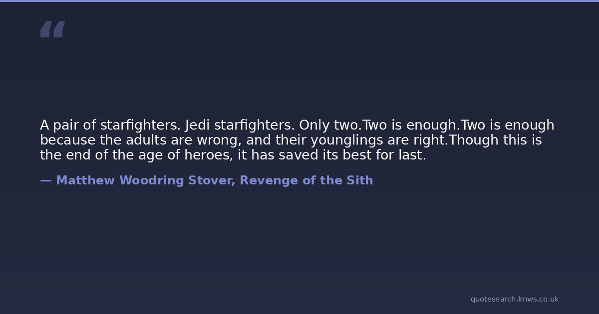 A pair of starfighters. Jedi starfighters. Only two.Two is enough.Two is enough because the adults are wrong, and their younglings are right.Though this is the end of the age of heroes, it has saved its best for last.