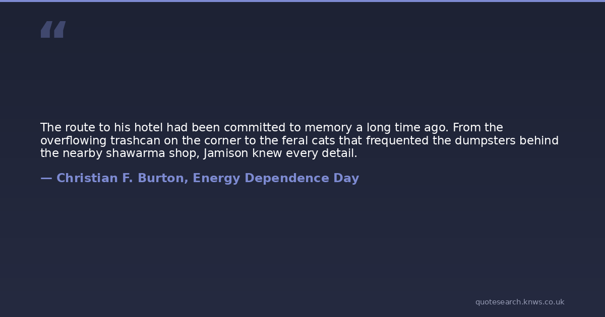 The route to his hotel had been committed to memory a long time ago. From the overflowing trashcan on the corner to the feral cats that frequented the dumpsters behind the nearby shawarma shop, Jamison knew every detail.