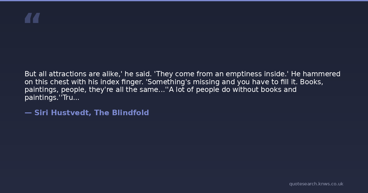 But all attractions are alike,' he said. 'They come from an emptiness inside.' He hammered on this chest with his index finger. 'Something's missing and you have to fill it. Books, paintings, people, they're all the same...''A lot of people do without books and paintings.''True,' he said, 'but that doesn't affect the argument.' Paris turned his head to one side and chewed on his lip. 'Of course, nothing ever does the trick. Nobody's really satisfied for long.