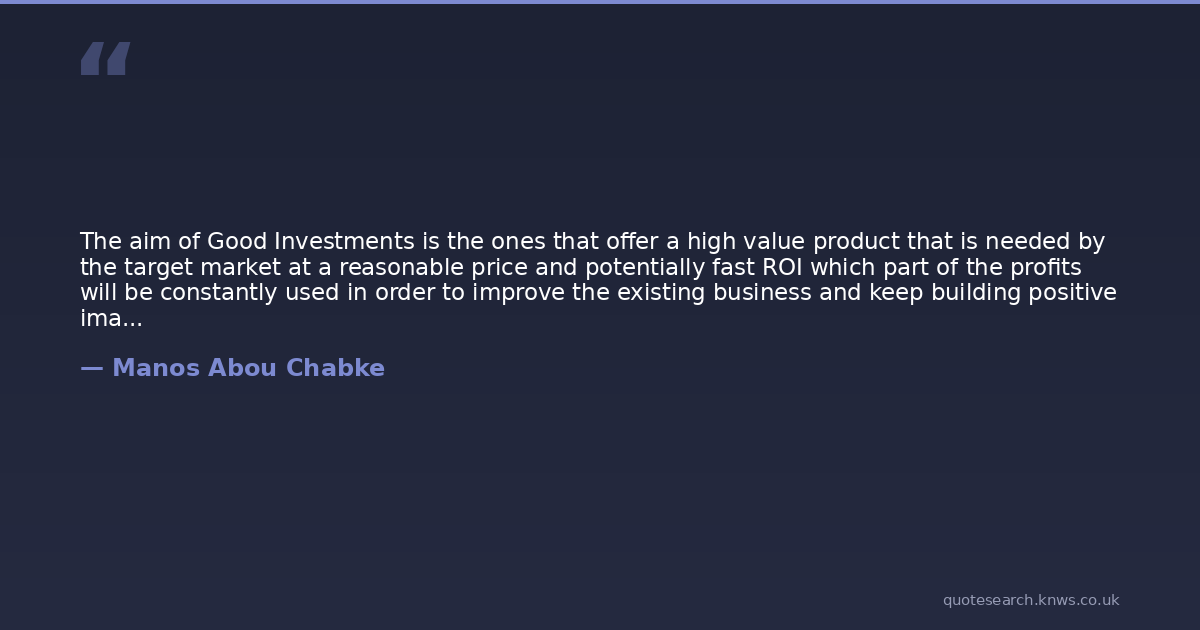 The aim of Good Investments is the ones that offer a high value product that is needed by the target market at a reasonable price and potentially fast ROI which part of the profits will be constantly used in order to improve the existing business and keep building positive image with charitable investments as part of the profits.