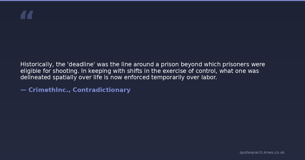 Historically, the 'deadline' was the line around a prison beyond which prisoners were eligible for shooting. In keeping with shifts in the exercise of control, what one was delineated spatially over life is now enforced temporarily over labor.