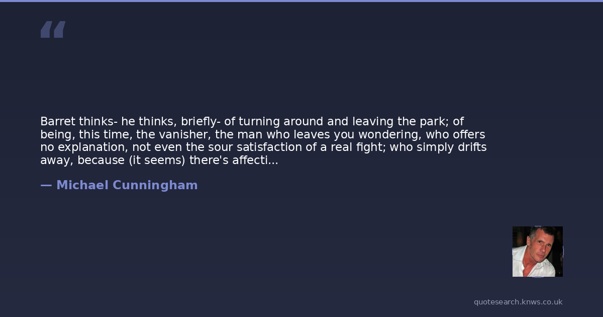 Barret thinks- he thinks, briefly- of turning around and leaving the park; of being, this time, the vanisher, the man who leaves you wondering, who offers no explanation, not even the sour satisfaction of a real fight; who simply drifts away, because (it seems) there's affection and there's sex but there's no urgency, no little hooks clasping little eyes; no binding, no dogged devotions, no prayers for mercy, not when mercy can be so easily self-administered. What would it be like, Barrett wonders, to be the other, the man who's had the modest portion he thinks of as enough, who slips away before the mess sets in, before he's available to accusation and recrimination, before the authorities start demanding of him When, and Why, and With Whom
