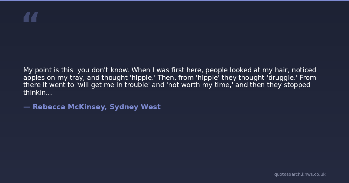 My point is this you don't know. When I was first here, people looked at my hair, noticed apples on my tray, and thought 'hippie.' Then, from 'hippie' they thought 'druggie.' From there it went to 'will get me in trouble' and 'not worth my time,' and then they stopped thinking at all. No one bothered to find out if what they thought about me was true. No one wanted to hear what I thought. No one cared what I believed in. No one cared about talking to me or asking what my plans were for the day or night. And then came you. Don't let what you think you know make him into what I could have been. Don't become someone who doesn't think, just because you don't like him for some reason. Because, quite frankly, I like how you think. Except for now, of course.