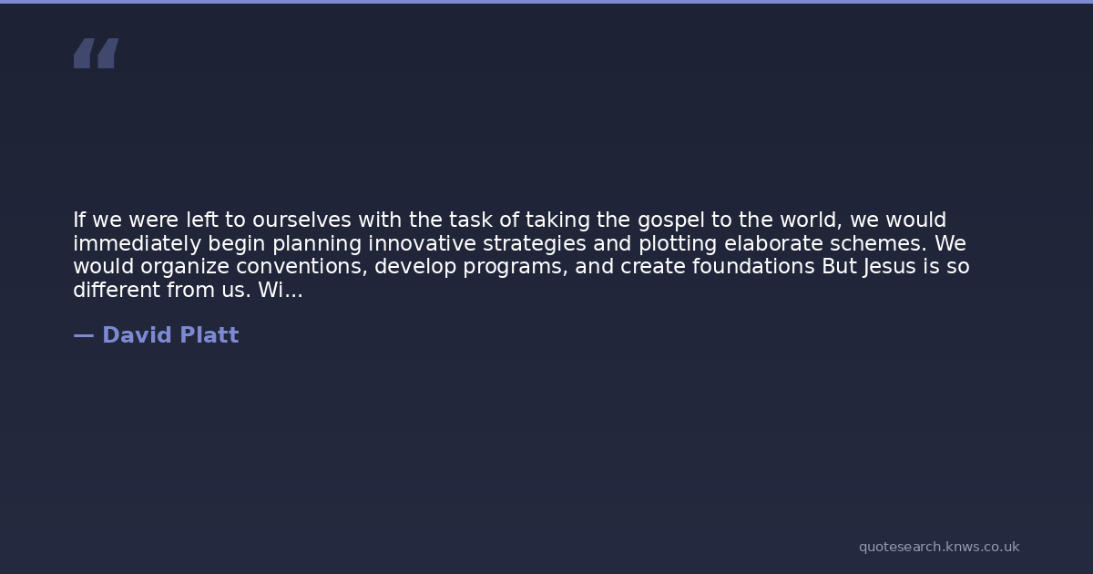 If we were left to ourselves with the task of taking the gospel to the world, we would immediately begin planning innovative strategies and plotting elaborate schemes. We would organize conventions, develop programs, and create foundations But Jesus is so different from us. With the task of taking the gospel to the world, he wandered through the streets and bywaysAll He wanted was a few men who would think as He did, love as He did, see as He did, teach as He did and serve as He did. All He needed was to revolutionize the hearts of a few, and they would impact the world.