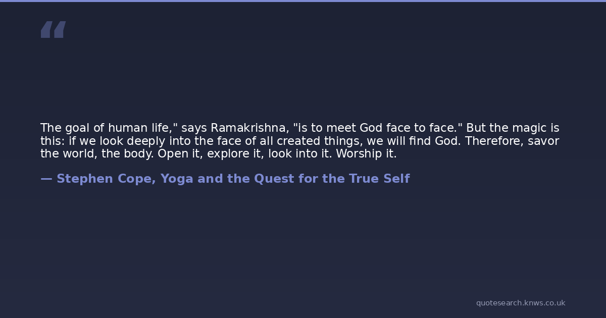 The goal of human life," says Ramakrishna, "is to meet God face to face." But the magic is this: if we look deeply into the face of all created things, we will find God. Therefore, savor the world, the body. Open it, explore it, look into it. Worship it.