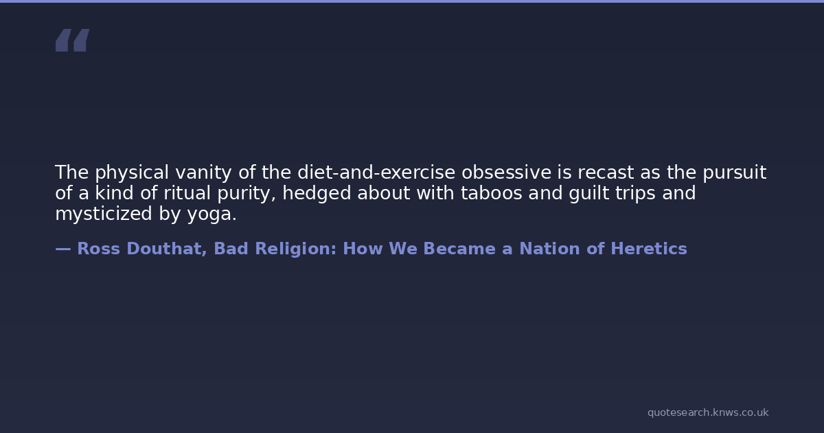 The physical vanity of the diet-and-exercise obsessive is recast as the pursuit of a kind of ritual purity, hedged about with taboos and guilt trips and mysticized by yoga.