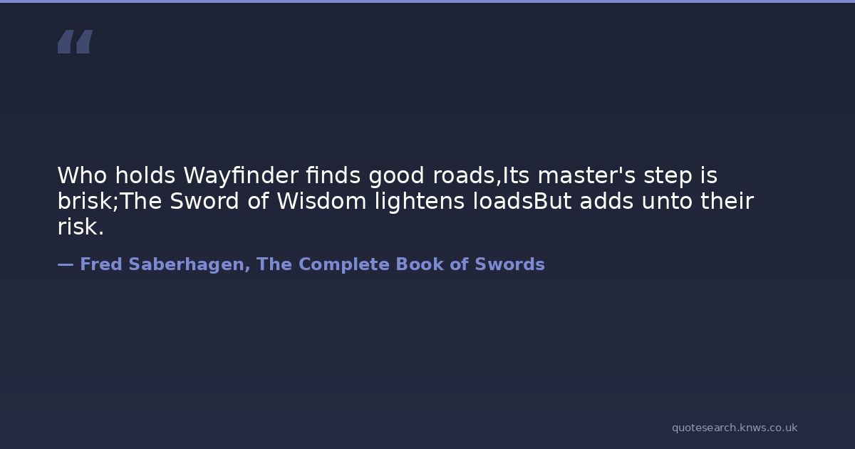 Who holds Wayfinder finds good roads,Its master's step is brisk;The Sword of Wisdom lightens loadsBut adds unto their risk. fantasy-fiction Download Image Share on X Share on Facebook Copy Link