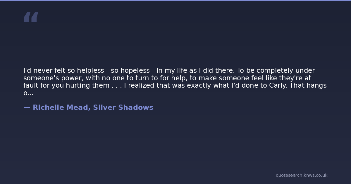 I'd never felt so helpless - so hopeless - in my life as I did there. To be completely under someone's power, with no one to turn to for help, to make someone feel like they're at fault for you hurting them . . . I realized that was exactly what I'd done to Carly. That hangs over me every day.