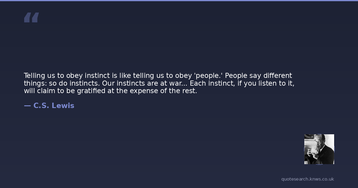 Telling us to obey instinct is like telling us to obey 'people.' People say different things: so do instincts. Our instincts are at war... Each instinct, if you listen to it, will claim to be gratified at the expense of the rest.