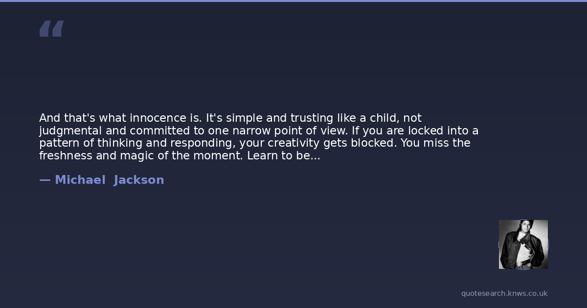 And that's what innocence is. It's simple and trusting like a child, not judgmental and committed to one narrow point of view. If you are locked into a pattern of thinking and responding, your creativity gets blocked. You miss the freshness and magic of the moment. Learn to be innocent again, and that freshness never fades.