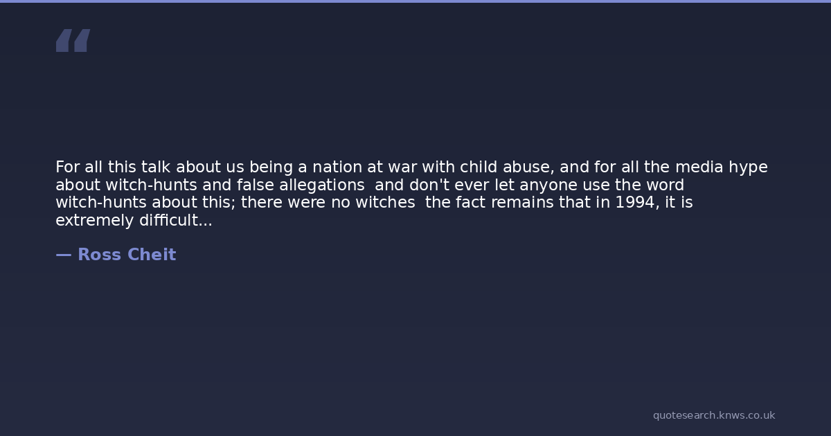For all this talk about us being a nation at war with child abuse, and for all the media hype about witch-hunts and false allegations and don't ever let anyone use the word witch-hunts about this; there were no witches the fact remains that in 1994, it is extremely difficult to come forward with allegations of sexual abuse. And the external forces of denial are almost overwhelming. If a case as verified as mine meets with denial, I dread to think about the experience of people who don't have the kind of corroboration that I do. And I really worry that we're getting close to a point where it's going to be impossible to prosecute child molesters, because we don't believe children, and now we don't believe adults. (Cheit "Paper presented at the Mississippi Statewide Conference on Child Abuse and Neglect" Jackson, April 29 1994.)