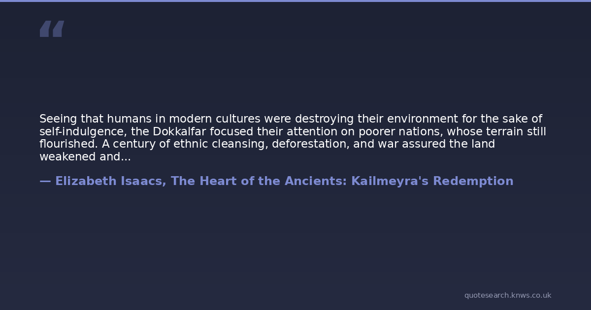 Seeing that humans in modern cultures were destroying their environment for the sake of self-indulgence, the Dokkalfar focused their attention on poorer nations, whose terrain still flourished. A century of ethnic cleansing, deforestation, and war assured the land weakened and humans stayed in abject poverty. The result was a perfect contrast. In certain parts of the world, millions of children died of starvation and disease while other countries held excesses and riches never before seen. Earth became a place of greedy extremes. Societies lost the ability to relate to one another, choosing instead to focus on their own. No one noticed the one common theme every culture held. The world itself was dying.