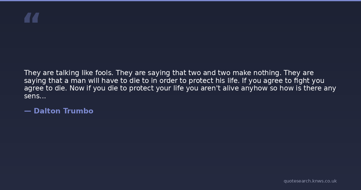 They are talking like fools. They are saying that two and two make nothing. They are saying that a man will have to die to in order to protect his life. If you agree to fight you agree to die. Now if you die to protect your life you aren't alive anyhow so how is there any sense in a thing like that? A man doesn't say I will starve myself to death to keep from starving. He doesn't say I will spend all my money in order to save money. He doesn't say I will burn my house to down in order to keep it from burning. Why then should he be willing to die for the privilege of living?