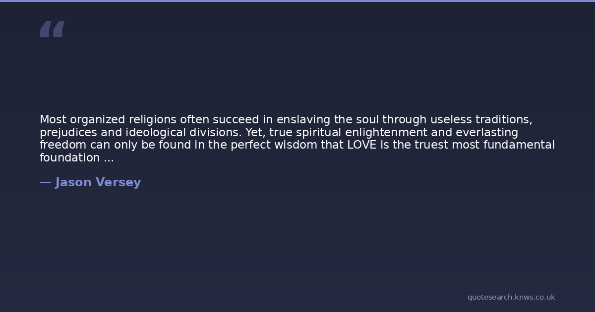 Most organized religions often succeed in enslaving the soul through useless traditions, prejudices and ideological divisions. Yet, true spiritual enlightenment and everlasting freedom can only be found in the perfect wisdom that LOVE is the truest most fundamental foundation of every faith which should, inevitably, lead every seeker down the path to the most profound introspective spiritual understanding one could ever know...we are all one.