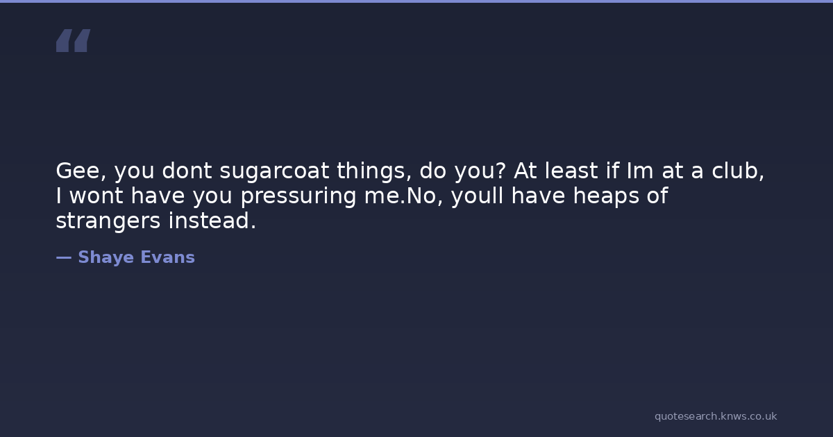 Gee, you dont sugarcoat things, do you? At least if Im at a club, I wont have you pressuring me.No, youll have heaps of strangers instead.